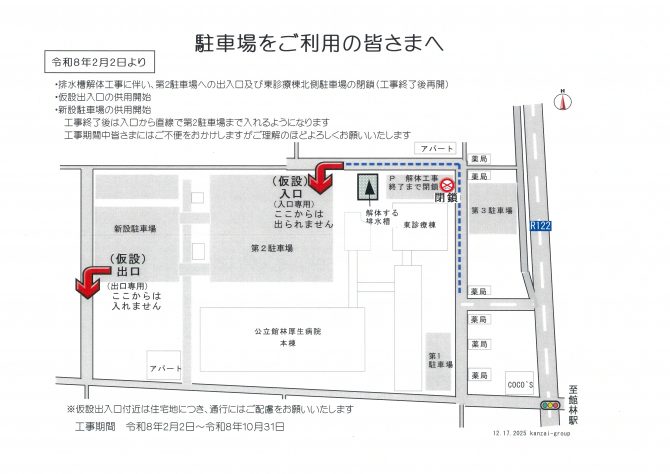 病院北側第2駐車場に入る際、通行の妨げとなっていた排水槽の解体工事を令和8年2月2日~令和8年10月31日の間で行います。