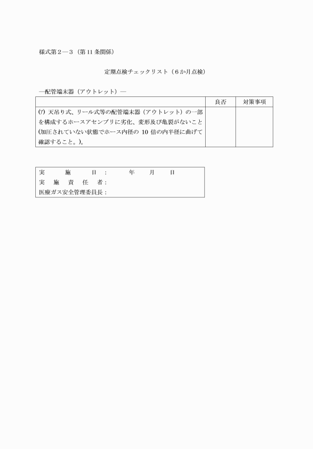 第9条 始業点検は、医療機器を配管端末器に接続する前及び接続した際に確認し、次の各号に掲げる点に留意すること。