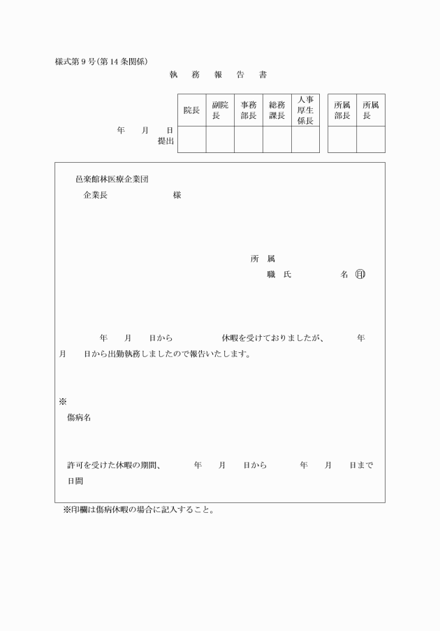 第13条 勤務時間等規程第22条の規定により病気休暇の期間が1月以上にわたる者が休暇の期間中又は休暇の期間が満了し出勤しようとするときは、執務承認願(様式第8号)に医師の証明書(診断書)を添え、所属部課長から院長を通して企業長に提出し承認を受けなければならない。
