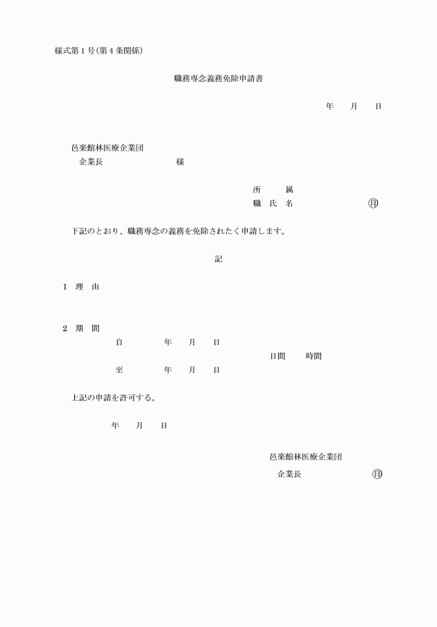 2 職員が、邑楽館林医療企業団職員の職務に専念する義務の特例に関する条例第2条に規定する職務に専念する義務の免除を受けようとするときは、職務専念義務免除願(様式第1号)により所属長を経て企業長の承認を受けなければならない。