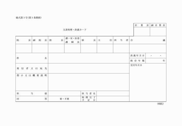 第3条 事務は、原則としてその事務を主管する職員から、文書処理、決裁カードにより順次直属上司の審査、関係部課科係の合議を経て決裁責任者の決裁を受けなければならない。